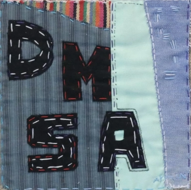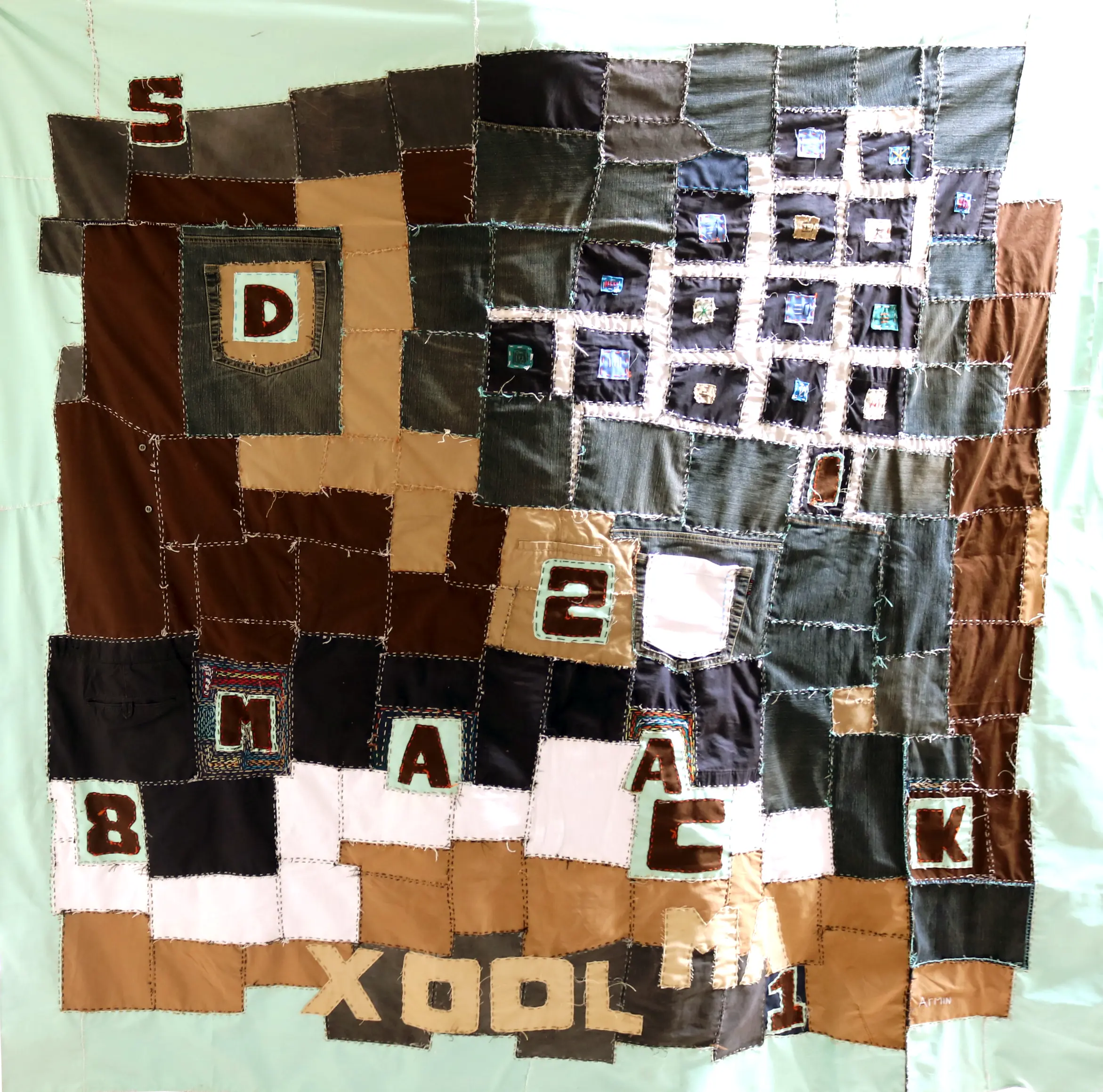 Armin Kane développe un corpus intitulé « L’Être en chiffres », fondé sur un principe simple et universel — A=1, B=2. À travers cette transposition alphanumérique, il explore la mémoire, l’identité et les fragments de la vie quotidienne — scènes de la Médina de Dakar, expériences de migration, dynamiques relationnelles… Son travail repose sur une logique de fragmentation numérique symbolique, inscrite dans la matérialité de textiles recyclés.