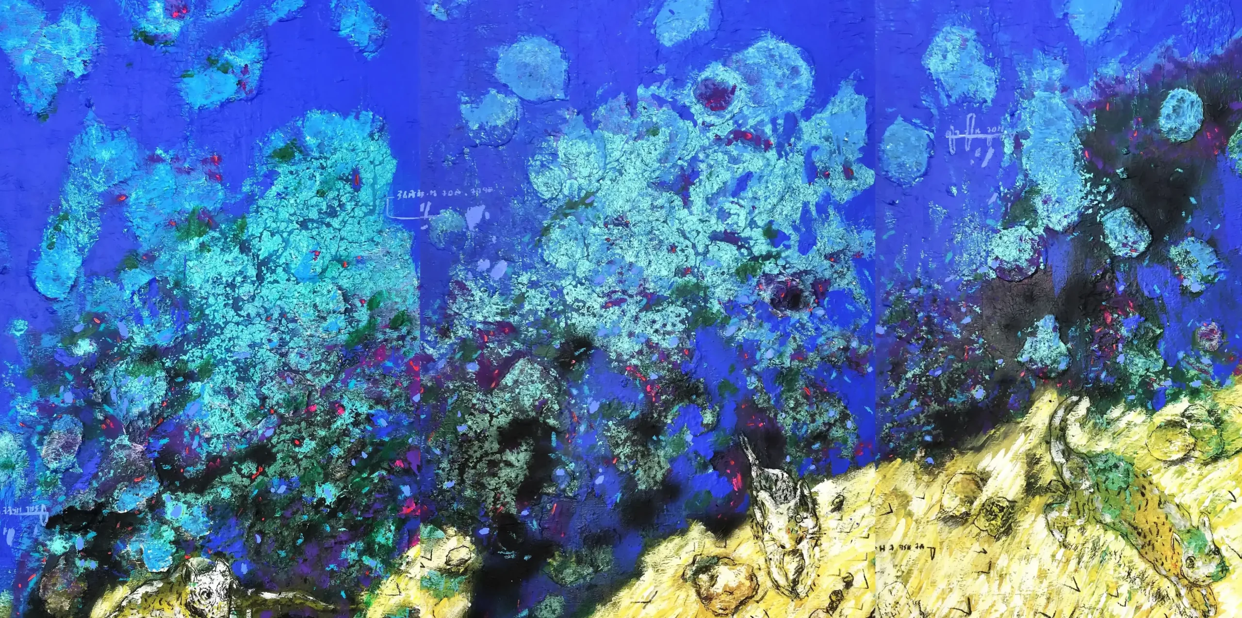 At the heart of a pluralistic totemic universe, blending secret myths and cosmology, the artist explores recurring themes that highlight the core of his work: human interaction within the fragile global ecosystem. All components of the natural world—animals, plants, inextricably linked to human beings—can be found throughout almost all of his work.